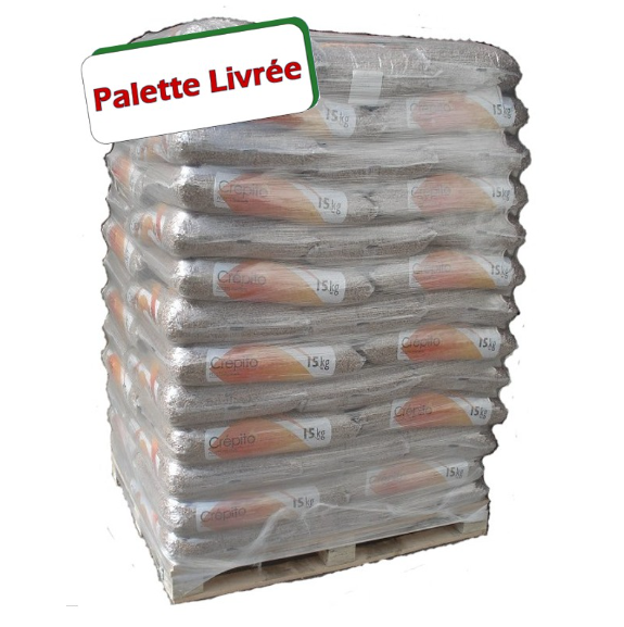 NOUVEAU CONDITIONNEMENT: Palette de 72 Sacs de Granulés de bois / Pellet de 15kg Crépito = 1080kg.